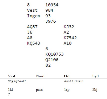 _____________________________________________________________________________________ Stig Dybdahl har sendt en hyggelig mail og forteller om både god spilling og bra glid under Trondheim Cup lagturnering. Han har behov for å komme med et spill eller to for som han sier: " I fare for at siden din kommer til å bli et eneste Klukken show de neste månedene, så tenkte jeg å legge med et spill eller et meldeproblem. Ihvertfall for Kunstneren som nekter å diskutere system fordi da kan det bli systemsvikt." Den logikken kan en vel diskutere , men i spillet under likte jeg 5hj veldig godt. "Se på hjerteren din makker. Jeg kontrollerer de andre fargene, men trumfen min er tynn." Ingen vitenskapelig meldning, men praktisk og en unngår misforståelser med en ny makker. Kun fire par kom i slem og med snill sits vant alle 13 stikk. Så fortsetter Stig: