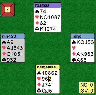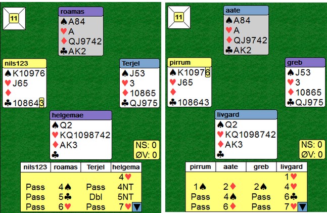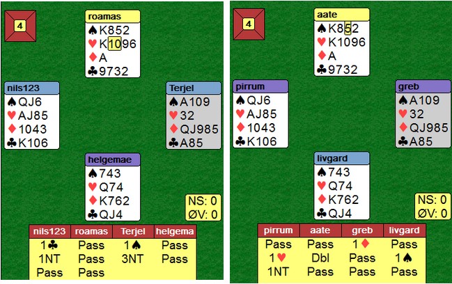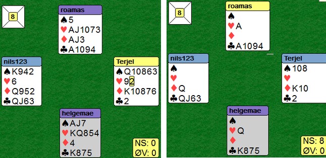 Per Erik Austberg var forhindret, så i hans sted stilte eks.landslagsspiller Odin Svendsen. Det fjerde paret denne gangen var veteranlandslagets Helge og Roald Mæsel. I tillegg spilte Nils Kvangraven - Terje Lie og Allan Livgård - Terje Aa. Det var en svært velspilt kamp over 16 spill synes jeg. Kortene var lagt på forhånd og det var mange slemsspill. Når vi ser alle kortene, er bridge lett. Det ble gjort masse gode avgjørelser av alle par, selv med kun sine 13 eller 26 synlige. Det var jammen ikke lett å vinne IMP!! Den første utgangssvingen kom til Nils og Terje der de dundret på i meldingsforløpet. Nils åpner på en hånd de fleste av oss passer og Terje Lie melder utgang der mange ville maks invitert. Når sparkappen gikk, var det ikke mulig å hindre hjemgang i 3NT. Jan Tore og Odin stoppet i normalkontrakten, men måtte betale ut en tier. Et fint poeng av Terje at han ikke melder NT med to små hjerter. Makker skal ofte være spillefører, så 1sp som overføring til 1NT virka smart. Dette var det mest interessant spillet, synes jeg Poenget er øst sin andre melding. Begge vest viser hjerter med 1ru-meldingen. Terje Lie løfter bare til 2hj, mens Jan Tore Berg hopper til 3ru for å vise singelton og hjerterstøtte. Over 2NT (minst invitt) hopper Terje Lie nok en gang forsiktig til 4hj. "Jeg har tillegg, men ikke nok til et cuebid". Odin Svendsen er naturlig nok ikke til å stoppe på det andre bordet. Jeg regner med at dette spillet vil bli diskutert på webmøtet etter kampen. Å splintre singel ess liker ikke jeg fordi det gir et galt bilde av håndens spillestyrke. Makker forventer honnører andre steder enn der de er i virkeligheten. Terje Lie på det andre bordet var uvanlig forsiktig igjen. Når du ser alle kortene, er det en helt grei slem å være i. Det er muligheter både i spar og kløver for det tolvte stikket, men ingen av fargene satt. Med f.eks ruter ut, står det slem om en velger å ikke røre trumfen. Tre ganger kløver for å kaste en spar og så krysse. Når hjerteråtteren ikke kan gi stikk, vil slemmen kunne vinnes. I praksis tror jeg ikke dette er beste spilleplan. En enkel sparkapp er nok matematisk beste plan, kombinert med knekten tredje i kløver. Venstrehåndsarbeid av Roald og Allan i 6hj var spillet over på et minutt. To ganger hjerter før han stjal to spar på den ene hånda og to ruter på den andre. I posisjonen under til høyre var det bare å slippe den første eller den andre kløveren og 12 stikk var hjemme uansett hvordan fargen satt. Spillet ble (selvsagt) kopiert på det andre bordet. Panterdobling av Jan Tore Berg Panterdobling er et uttrykk for å doble et utgang som står hos motparten når du "vet" at de vil ta ut. 3NT er til å slenge i veggen, men Allan Livgård som hadde meldt 3NT med to små i motpartens farge turde ikke stå med og stoppa i 4ru. Roald Mæsel løfta fint makker 4ru til 5ru på det andre bordet og vant en fin utgangssving. Så var det en storeslem ved begge bord Helge Mæsel sin åpning i 4hj var mildt sagt i overkant. Jeg kjenner de som til og med ville åpnet med 2kl for å hoppe til 4hj neste gang. Han kom imidlertid sterkt tilbake. Legg merke til Roald Mæsel sin 4sp-melding. Når makker åpner med 4hj, skal den fargen være trumf og 4sp setter fokus på det svake punktet i ruter. Nå var ikke Helge til å stoppe. Allan legger også inn en storeslemsinvitt med 6ru og Terje Aa brukte ikke mange sekunder på å melde 7hj, Nye konvensjoner Det dukker stadig opp meldinger jeg ikke har sett brukt på denne måten før. Etter 1hj - 1sp - 2hj kan det være vanskelig hvis 1sp-melderen har gode kort. Mange vil måtte kreve med 3-kortfarger på 3-trinnet. Terje Aa og Allan Livgård har løst dette ved å spille 2sp som et generelt utgangskrav. Makker har alltid seks hjerter når han gjentar den over 1sp, så hvis syd har lang spar og svake kort, må han passe. Det er godt mulig de har andre måter å vise en svak hånd med spar (1hj - 2sp kanskje?) 6sp var uavgjort spill siden det var bare å stjele ruterutspillet, ta ut trumfen og kappe hjerteren. Et IMP er et IMP Selv med åpne kort vil mange slite med å vinne tretten stikk, men Terje Lie hadde ingen problemer uten å sett kontrakten i fare. Hjerter ut til esset (bort med en kløver), ruter ess og ruter til damen fulgt av fire ganger spar. Når trekort ruter hadde fire spar, forsvant to kløver i bordet og en kløverstjeling gir det trettende stikket. Fint håndverk som betaler seg bedre i par enn i lag. Skulle noen stjele spar tidligere, er tolv stikk aldri i fare. ______________________________________________________________________________
