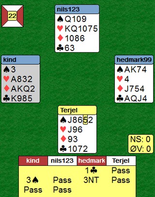 Jeg blir mer og mer sikker på at jeg har et poeng. I sin iver etter å ha tett utfylte meldekort og systemkompendier så tykke at en kan slå i hjel smågriser, mister selv de aller beste spillerne hodet. 3sp viser 1444 fordeling og da måtte nesten Asbjørn Kindsbekken melde det da.. Jeg griner. Hvorfor kan dere ikke melde de fargene dere har? En og en. Nedenfra og opp. Hvis dere finner tilpass, støtter dere hverandre. Ja, jeg vet det er umoderne og bakstreversk, men det virker. Å komme til storeslem i minor er kanskje mye å forvente, men 6kl/6ru må da være mulig for topparene våre?