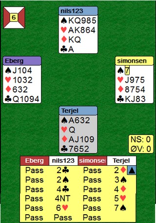 Så var det Nils og Terje sin tur til å melde storeslem. Ingen vansker med det, men i all beskjedenhet skulle da det bare mangle. Noen vil sikkert ha åpnet med 1sp, men jeg liker at åpningene på 1-.trinnet tross alt ikke kan være supersterke. 2ru kan inneholde mange type hender, mens 3sp viser støtte og gode kort. Nils sin 4kl er kortfarge (3NT ville vist en balansert hånd). To ess i svar på Blackwood, mens 6hj spør etter tredjekontroll for å skjekke at hjerteren ikke er EKxxx mot xxx og ikke avkast. Godt å se at dette er under kontroll, gutter!!