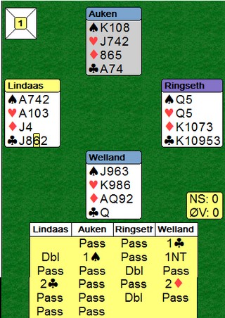 Allerede i spill 1 ser vi at Jørn Arild og Pernille har planer om å gjøre det bra. Å doble opplysende med 10hp og 4-3 i major mot en passet makker, er ikke slik jeg spiller. Ikke parturnering en gang, men det er sikkert grunnen til å jeg aldri vinner slike turneringer. Jørn Arild følger opp og dobler alt motparten foretar seg. Kløver ut fra vest slipper spillefører og da ble det to beit. +300 må være tett på en topp?