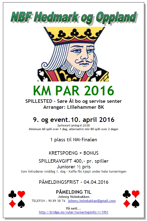NM Par 2016 arrangeres av Kristiansands BK på Clarion Ernst Hotell 23.-25. september. All informasjon om arrangementet finnes på arrangørens hjemmeside.