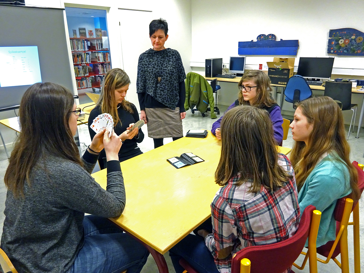 Eit bilete frå kurset. Med ryggen til sit Marte (med kort) vidare frå venste Lea, Fartein, Daniella og Edel (med ryggen til). Torhild ståande i bakgrunnen.