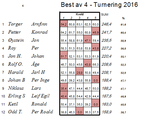 5 1/2 bord var meget hyggelig, bløtkake fra Jørgensen i nye lokaler var kanskje noe av grunnen! Håper vi fortsetter slik! Best for kvelden var 2 ganger far og sønn, først Øyvind og Bo Lennart - godt foran Espen og Petter. 3. på pallen var Per Egil og Helge. Her er kveldsresultatene: 1. Øyvind og Bosse 67.7% 2. Espen og Petter 55.1 " 3. Per Egil og Helge 54.2 " 4. Ivar P. og Arne Ny. 52.6 " 5. Johan og Ivar 50.5 " Bjørn Torgeir og Odd Bjørn 50.5 " 7. Irene og Per Elvin 47.4 " 8. Espen H. og Trond H. 44.3 " Elin Mari og Tom 44.3 " 10. Randi og Mette 42.7 " 11. Arne og Trond Atle 40.1 "