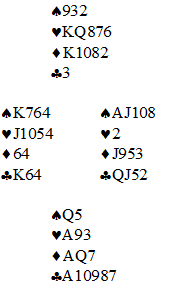 S var giver og åpnet med 1 ruter. Etter pass fra motparten svarte N 1 hjerter (det lover 4+ som svar og skal meldes for å finne en mulig 4-4 tilpasning) og med sin gode åpnings styrke og flott tilpasning og fordeling kan S velge direkte hopp til 4 hjerter. Det gjorde Svein Skaufel og Ragnar Andersen, og både Helge Koren og Jan Arnesen som var i N gikk deretter til lilleslem. Ved de to andre bordene ble det stopp i 4 hjerter.