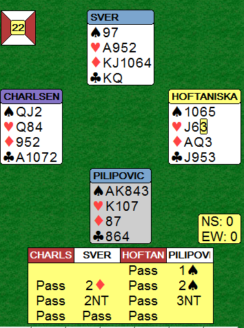 Sluttkontrakten er mildt sagt forferdelig. Med beste motspill blir det ikke mange stikkene til vest, det ser ut som minst fire doblede. Motspillet var imidlertid langt i fra full klaff, og Charlsen skrapte sammen seks stikk, -500, et stygt resultat (selv om det kunne vært verre) på det som normalt er en delkontrakt til N/S.