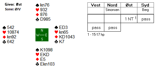 Aktuelt spilte spilte Espen ess, konge i ruter og gikk en bet, men finnen ved det andre bordet spilte dårlig og gikk to bet. Dermed en forsiktig pluss til Norge. Motpartens kort var: