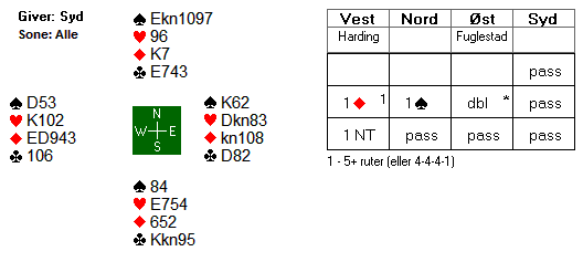 Dagens spill er fra kampen mellom Norge og Spania i dameklassen. Marianne Harding ble spillefører i 1 NT i vest etter at nord hadde meldt inn 1 spar. Spillet så slik ut: