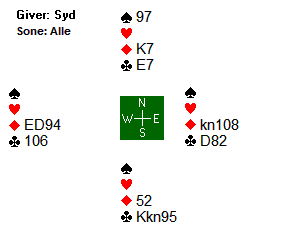 I stikk to spilte dermed Marianne hjerter til dama, som hun håpet å få beholde stikk for. Dessverre stakk syd med esset og spilte spar. Nord vant med esset og godspilte farga ved å spille nok en spar. Marianne fortsatte med hjerter til kongen, hvorpå nieren kom på fra nord. Etter å ha stukket over neste hjerter og tatt det siste stikket i den farga var Marianne inne i bordet i følgende posisjon: