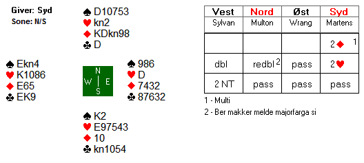 På det andre bordet meldte svensken Johan Sylvan seg på over multiåpninga til Krzysztof Martens. Det endte med at han til slutt ble spillefører i 2 NT. I den kontrakten ble det hele fire beit.