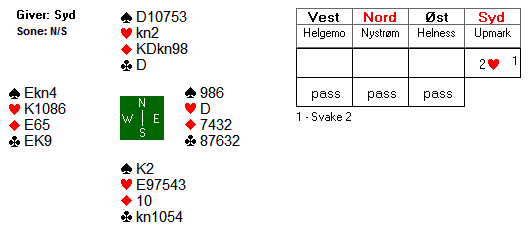 Aktuelt gikk det pass rundt. Geir og Tor spilte motspill mot 2 hjerter og tok ei strøken beit for 100 inn. Som du ser hadde ikke Tor stort å bidra med av honnører i dette spillet.