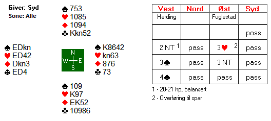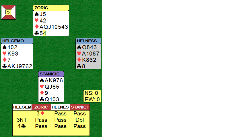 Helgemo sin 3 NT var en frisk gamble, og der ville han spilt om han ikke hadde blitt doblet. Faktisk kan ikke 3NT rokkes siden kløverfinessen går og fargen sitter 3-2. Men da syd doblet kunne nesten ikke Helgemo stå med, for det kan fort bli forferdelig kostbart. I 4 kløver fikk han ti stikk, +130.