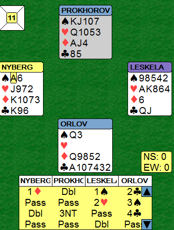 Ved det andre bordet kom Finlands N/S i 5 ruter som også ble doblet. Det endte med to doblede, og det ga 13 IMP til Russland.