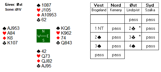 Spillet gikk russernes vei, og det på en brutal måte. Russlands syd åpnet med 1 grand, og makkeren meldte 3 grand med 9hp! Det satt som det skulle, og kontrakten gikk greit hjem. Da Finland ikke unaturlig stoppet i 1 grand ga det 9 IMP til Russland.