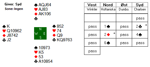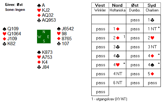 Det var en del slemspill i denne kampen. I kampens tredje siste spill var Thor Erik og Thomas i slemsonen igjen. Veien til lilleslem i grand startet med åpning 1 kløver i syd. Thor Erik fikk selvsagt slemambisjoner i nord. Etter at Thomas først gikk ned i 3 grand tok han så med seg et rutercubeid da Thor Erik gikk på med 4 kløver. Etter å ha sjekket at det ikke manglet to ess ble kontrakten parkert i 6 grand. Her er alle kortene: