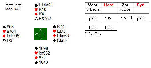 Øst spilte ut liten ruter som ble stukket med esset og liten hjerter til esset fulgte. Liten trumf til damen og ut- trumfing og så liten spar til esset. På hj K forsvant en ruter, og på ny hjerter til stjeling skjedde ikke noe til hjelp og da Øst klarte å beholde sparene sine ble det 12 stikk og +1370.