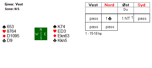 At der avsluttes bra gir løft også om man ellers ikke har hatt all verden av glid underveis. Johan Wedeen (S)- Magnus Larssen (N) fikk bra score ved bl.a. å overvinne skjev trumfsits. S giver og alle i faresonen.