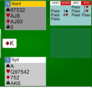 Knut valgte å spille ruter, Syd kom inn på kongen, men da den var blanket var innspill perfekt. For Syd måtte spille opp fra hj Jxxx. Den fargen kunne jo ikke kort sakes fra siden knekten 4.var hold. To andre vant 6 grand (en som Vest etter sp 2 ut fra Nord!) mens 3 gikk bet.