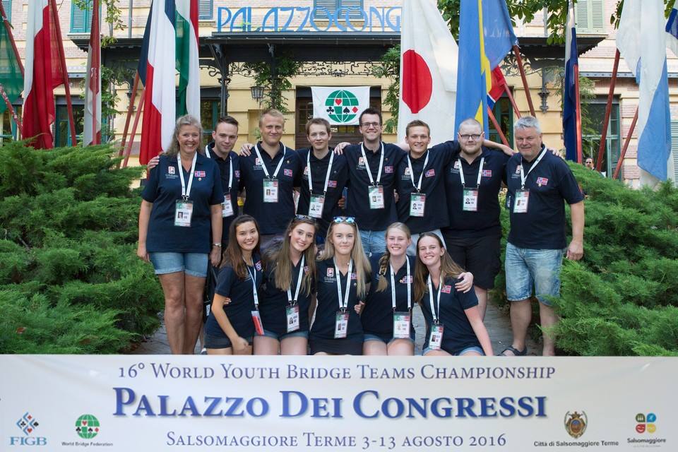 Den norske troppen i Ungdoms-VM 2016: Bak fra venstre Elisabeth Sjødal (coach Jenter), Anders Gundersen, Tor Eivind Grude, Christian Bakke, Lars Arthur Johansen (coach U26), Marcus Scheie, Harald Eide og Lars Eide (kaptein U26). Foran fra vesntre Thea Indrebø, Katarina Ekren, Thea Hauge, Sofie Sjødal og Agnete Kjensli. Sven-Olai Høyland (kaptein Jenter) var ikke tilstede da bildet ble tatt. Foto: World Bridge Federation