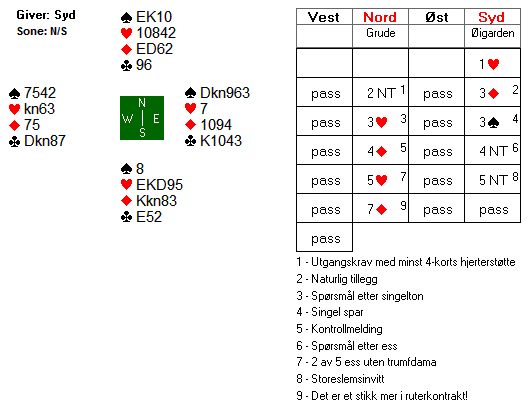 For Norges damelag satt Liv Marit Grude i nord. Da makker Bodil Nyheim Øigarden bekreftet at alle nøkkelkortene var på plass fant hun en genial melding. Hun byttet rett og slett trumf og hoppet til 7 ruter. Hun ser at man kan kaste nords kløvertaper på den femte hjerteren i ruterkontrakt.