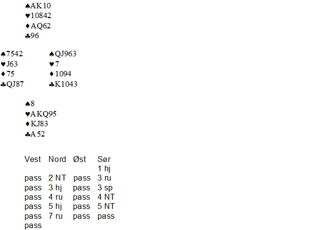Ingen andre kopierte denne kontrakten hverken i dameklassen eller i åpen klasse. De aller fleste spilte lilleslem i hjerter, mens en håndfull ulykksalige prøvde seg i 7 hjerter, og enda noen flere stoppet i utgang.»
