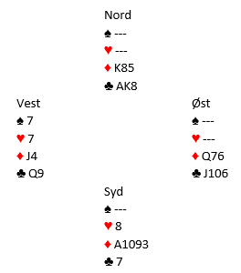 På hjerter 8 må øst kaste inn håndkledet. Han er alene om å holde begge minorfargene og må gi opp en av dem. Men kontrakten bør gå bet. Idet hjerter spilles fra syd i andre stikk bør vest legge liten. Da er nord inne, og spillefører får ikke spilt mer trumf uten å spille seg hjem i ruter (ødelegger forbindelsene til skvisen) eller ved å stjele spar eller kløver. Stjeler han seg over til syd får vest tid nok til å korte spillefører enda en gang, og vest vil da få tre trumfstikk.