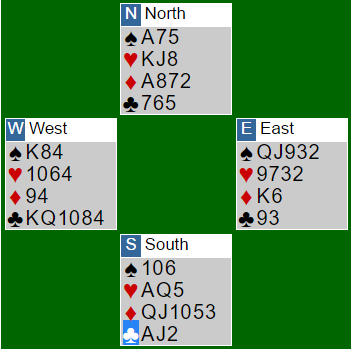 Etter å ha lagt kløver knekt (!) i første stikk vant syd med kløver ess i andre stikk og tok ruterfinessen. Da den røk ble det ni stikk. Dette var en uvanlig start på spillet! Hvordan kunne syd finne på å gjøre det?