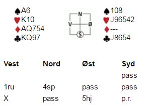 Etter at vest hadde åpnet med 1 kløver endte jeg som nord i 4 hjerter. Kløver konge kom i utspill til esset. Det så ut som fare for at hvis de kom inn før trumfen var tatt ut så ville det komme kløver og mer kløver fra vest slik at trumfhøyning truet. Men det hjelper ikke å ta ut trumfen, for da er blindemann en ørken, ingen inntak til kløveren, og det vil bli to rutertapere og en taper i hver av de sorte fargene. Så inntakene til nord må brukes til å spille ruter, og hvis den trumfhøyningssituasjonen jeg nevnte oppstår må hjerter knekt sitte høs vest. Så kløver ess vant første stikk fulgt av ruter til tieren og østs dame. Det kom spar til esset og mer spar. Her gjorde faktisk vest en feil, han skulle tatt for kløver dame først (kløveren kan ikke utnyttes uansett siden øst har fire trumf). Hvorfor han burde tatt for kløver dame vil du få se om litt. Inne i andre sparrunde ble hjerter konge spilt, så hjerter til esset. Dette var igjen: