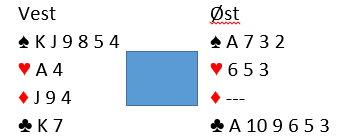 En ganske ordinær åpningshånd, men 7 spar er en meget god kontrakt. Det er haugevis av andre vanlige åpningshender som kan gi lille- eller storeslem til Ø/V, men selvsagt også mange bra åpningshender som ikke gjør det. Hvis det er tilfellet - vi har bare ti-elleve stikk i sparkontrakt - så vil vi antagelig finne ut at det ikke er noen god slem hvis øst melder teknisk korrekt. Og det er å hoppe til 4 ruter. Åpneren får da et bra bilde av hvordan det ser ut og kan ofte ta den riktige avgjørelsen.