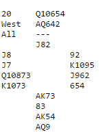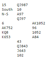 Men de fleste spiller «standard» og da åpner syd med 2 grand (20-21 hp). Har du og din makker noen metode for å sleminvitere med 5-5 i major over makkers 2 grandåpning? Hvis ikke blir dette gjettverk. En løsning kan vel være å overføre til spar for så å hoppe til 6 hjerter, eller kanskje 5 hjerter. En slik sats kan vel være «fali» det også, men å bare gå for utgang er tilsvarende «fali», og det kan bli tapsspill hvis det viser seg at slem står. Det kan godt stå slem i spar eller hjerter, men om 2 grandåpneren har en trist hånd uten så mye toppkontroller og/eller for mye «bortkastet» i ruter, behøver det langt i fra være noen slem. De som har byttet om grandintervallene og åpner med 2 grand når de har 22-24 hp, og 2 kløver med 20-21 får det lettere da nord kan starte med naturlig 2 spar som svar på 2 kløver og i neste runde få meldt hjerteren på et komfortabelt nivå. Slik så hele spillet ut: