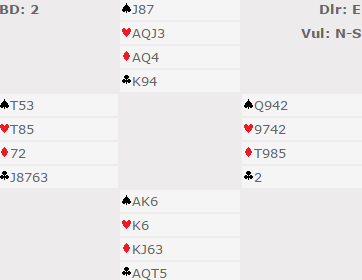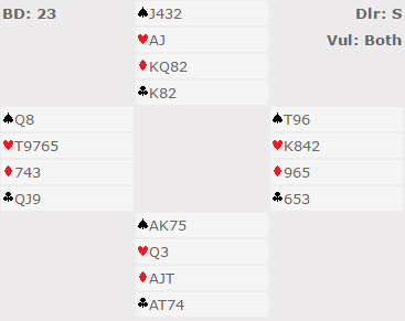 Meldt og vunnet 7 grand burde ikke gi utslag i dette spillet. Men i et stort og ujevnt felt er det alltid flere som bommer og spiller lilleslem, sogar noen par i utgang! De som satt N/S og noterte +2220 fikk hele 7 IMP på butleren, og de som sitter i mot har vel ikke fortjent minuspoeng i det hele tatt. Hvis det er mange slike spill kan butlerresultatene bli et lotteri.