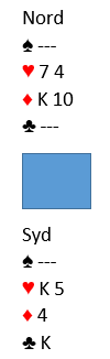 Spar- og kløverstikkene tas, kanskje etter å ha tatt for ruter ess på et tidspunkt. Fra nord kastes ruter både på den fjerde sparen og fjerde kløveren. Før den siste kløveren fra syd ser N/S sine kort slik ut: