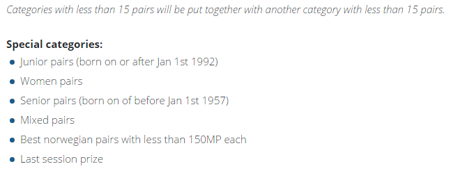 Av de som kommer med ambisjoner om å kapre den storflotte førstepremien i åpen klasse vil det først og fremst være omtrent det som kan krype og gå av norske toppspillere. Det blir tretten hovedpremier (forutsatt at 250 par deltar). Førsteprisen er på fantastiske kr. 300.000 (ca. 33.000 Euro).