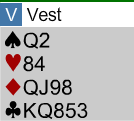 Noen vil kanskje hevde at vest bør svare 1 spar. Det ville ført frem her, men mye oftere enn at vi har utgang i kortene kommer vi for høyt om det svares med så svake kort. Ikke sjelden kommer åpneren tilbake med 2 grand, eller 3 hjerter, og det blir et unødvendig betespill. Og hvis åpneren er sterk (andre kort enn dette) får han den riktige beskjeden med pass fra svarer, så om motparten kommer med vil ikke øst melde for høyt senere. Så pass med vests kort er korrekt slik jeg ser det