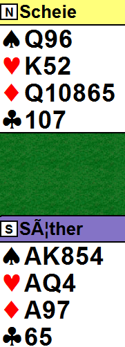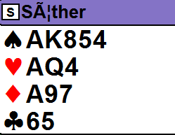 Det kan virke automatisk åpne med 1 NT, men er hånden verd bare 17 hp? Nei, dette er nok en litt sterkere hånd enn 17hp. Kaplan-Rubens håndevaluator (finnes online) som dog ikke er noen fasit sier faktisk at kortene er verd 18,5hp. Sæther viste etter min mening god kortvurdering og åpnet med 1 spar i den hensikt å vise 18-19 senere. Dermed kom han og makkeren Markus Scheie i 4 spar, mens de som åpnet med 1 grand spilte delkontrakt. Slik så N/S sine kort ut: