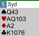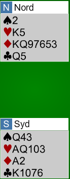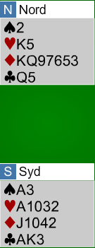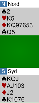 Her har svarhånden en dårlig sparfarge, og han bør ikke satse på 3 grand. Han melder 4 ruter over 3 spar og sier med det at 3 grand skal vi i hvertfall ikke spille. Slik ser N/S sine kort ut med den åpningshånden:
