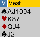 Nord hadde meldt omtrent som om han hadde stjålet kortene, men lilleslemmen var ikke helt håpløs. Spesielt ikke etter spar ess i utspill! Utspillet ble trumfet, og syd hadde fått godspilt to stikk i den fargen. Det var fortsatt ikke så lett å se hvordan dette skulle bli tolv stikk. Det kan se ut som om det kan gå an å spille god kløverfargen, men da må det stjeles to ganger hos syd, og det blir litt problemer med overgangene for å få hentet stikkene på begge sider. Men Huang viste sin klasse og spilte nesten som om han visste kortene - perfekt timing. Fortsettelsen var kløver ess og kløver til stjeling, ruter ess og ruter til kongen. Da var dette igjen: