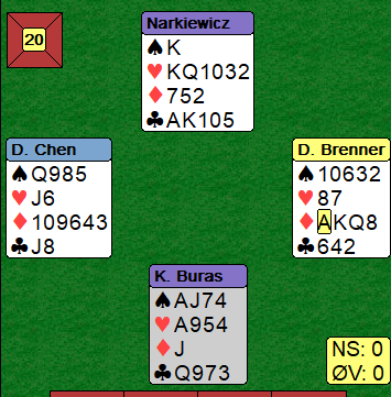 Ø/V har 2-3 spar i kortene, og da Zimmermann meldte en gang til etter at Thoresen hadde flyttet fra 1 grand til 2 spar viste ikke det norske paret noen nåde. Motspillet satt vel ikke helt hundre prosent, men det ble likevel +500 og en skyhøy score.