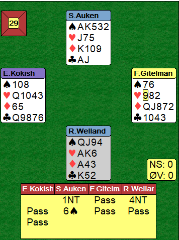 Begge de norske parene hadde solide lister. Det kunne kanskje se ut som et feilskjær i spill 29 da det norske paret gikk bet i en slem hvor det ved første øyekast ser ut som det bare er å ta en enkel finesse. Så enkelt er det ikke alltid, spesielt ikke for en ekspert. Slik så det spillet ut: