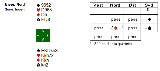 Ganske hardt meldt av Christian Bakke. En invitt ville antagelig ha ført frem også, for Espen Flått har fine verdier selv om fordelingen er flat. Det spørs også hva invittene bør bety over 2 spar i slike situasjoner, for eks. kan dobler kanskje være kortfargeinvitt med singel spar (?).