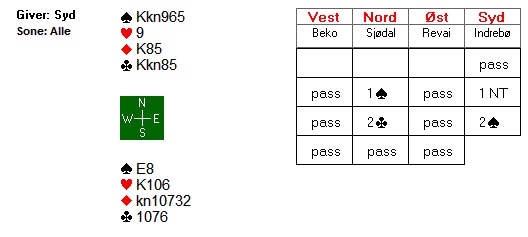 Den norske øst åpnet med 1 grand som makkeren passet på, og da N/S kom innpå og var i 2 spar gikk det pass rundt.