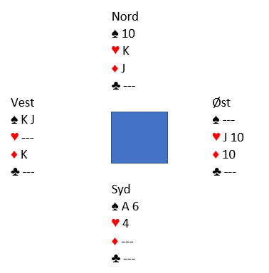 Hun så etter det litt sære sparutspillet for seg en svindelvariant kombinert med kanskje en skvis hvis utspilleren også hadde ruter konge. Etter en kløverrunde spilte hun ruter dame! Den burde nok vest ha stukket, men da han kanskje hadde et fåfengt håp om at makkeren kunne komme inn la han liten. Så ruter dame vant stikket og tolv stikk var sikre uten at forsvaret hadde fått noen stikk så langt. Marianne kjørte i gang med kløverstikkene. Etter de var brukt opp tok hun for ruter ess og hjerter ess, og dette var igjen: