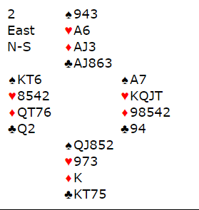 Med MUlti 2 ruter fra Tor Martinsen svarte Jan P. Johannesen 2 hjerter men da makker viste sterk hånd med 2 NT etterpå overførte han til hjerter (via 3 ruter) og gikk så via Blackwood til 6 grand. Gunnar Saxegaard- stoppet i utgang.