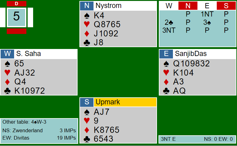 Der nederlenderne satt Ø/V valgte øst å åpne med 1 kløver som var kunstig og sterk. Vest svarte 1 spar som såvidt jeg forstod viste kløver. Deretter ble spar meldt et par ganger av øst, og sluttkontrakten ble 4 spar. Uheldigvis for nederlenderne ble vest, verdenmesteren Luuk Verhees spillefører. Det er litt tilfeldig at dette ble så galt, for når det var syd som hadde ruter konge ble det nitrist idet nord spilte ut ruter knekt. Spillefører føk opp med ruter ess og tok for kløver A-Q. Siden knekten kom trodde han ikke på at det ville gå å bli kvitt rutertaperen på kløver konge, og valgte å satse på å gjette hjerteren samt at nord kanskje hadde spar knekt. Derfor tok han hjerterfinesse med knekten, antagelig for å ha to inntak til å spille spar mot øst. Resultatet ble at taket falt i hodet på han. Etter denne innledningen ble det hele tre bet, -150, og 11 IMP til det indiske laget.