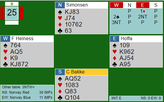 Ved det andre bordet tok også N/S fire sparstikk. Forskjellen der var at nord var inne til slutt og så øst som blindemann, for der var vest spillefører. Nord visste ikke hva han skulle spille fra etter fire runder spar, da han satt med knekten tredje i hjerter, ruter 10 fjerde og to små kløver. Alt kan være favør og hjelpe spillefører. Da han valgte kløverskift rett opp i vests saks (som nord altså ikke så) ble det enkelt ni stikk og +600, 13 IMP til Norge Rød som til slutt vant turneringen.
