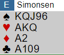 Steffen Fredrik Simonsen og en polakk med et navn jeg neppe klarer å stave riktig selv på flere forsøk satt øst. Steffen åpnet med 2 kløver. I andre melderunde har han et valg, vise hånden som 23(2)-24 grand, oppgradere til 25(4)-27 grand, eller melde sparfargen og da vise en mer ensfarget hånd, normalt. Her blir det litt ubekvemt å vise 24-27 (som man nok synes hånda er verd) hvis det i systemet er åpning 2 kløver fulgt av et hopp til 3 grand, for med dette kan det veldig godt være bedre i sparkontrakt. Spilles det med "Kokish" etter 2 kløver-2ruter får man (via 2H - kunstig) etter hvert vist den råsterke grandhånda med 2NT, og makker kan finne ut om grandhånda har femkorts major via Puppet Stayman.