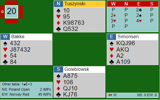 Steffen valgte å gjenmelde 2 spar. Christian meldte 3 hjerter som åpneren løftet til 4 hjerter. Det ville blitt sluttkontrakten om øst hadde vist grandhånd også, i såfall spilt av øst etter overføring. Det norske paret noterte +650, egentlig et normalt resultat på spillet som så slik ut: