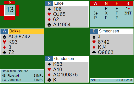 Dette er fra lederlagets (THORESEN) kamp mot SMITH som ligger plassert et stykke bak i køen så langt. THORSEN vant kampen med 2 IMP.