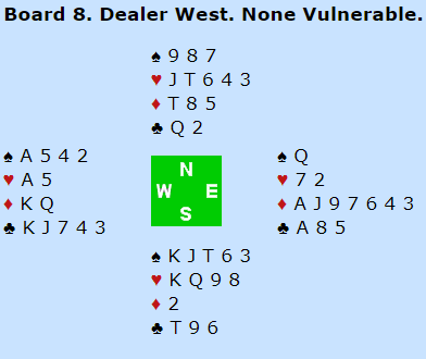 Det er en glimrende lilleslem, og ikke så veldig dårlig lilleslem. Men i 6 ruter er det dog en fare for å gå bet etter hjerterutspill. Da er det nesten slik at det ikke er så mye dårligere sjanser i 7 ruter. Og Polakkene meldte 7 ruter! Den var avhengig av å løse kløverfargen. Det er tre mot to odds i favør av esset fulgt av finesse fremfor å toppe etter damen dobbel, og polakken gikk to bet da han tok kløverfinessen og hadde fått hjerterutspill.