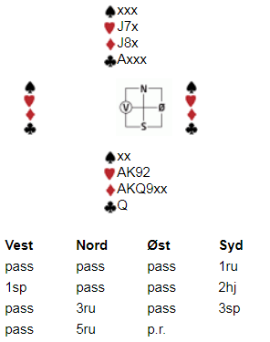 V vet at S har 11-12 HP og må ha kl A. Da har S 5xkl+ 2xru+2x sp mer sp A om sp D vinner. Altså må V stikke med sp K og eneste håp er god hjerter med K i Ø. Retur av hj 7 til K og hj 10 dreper kontrakten. 2 bet. Har Ø i stedet sp A og to mellomstore hjertere blir det også bet!